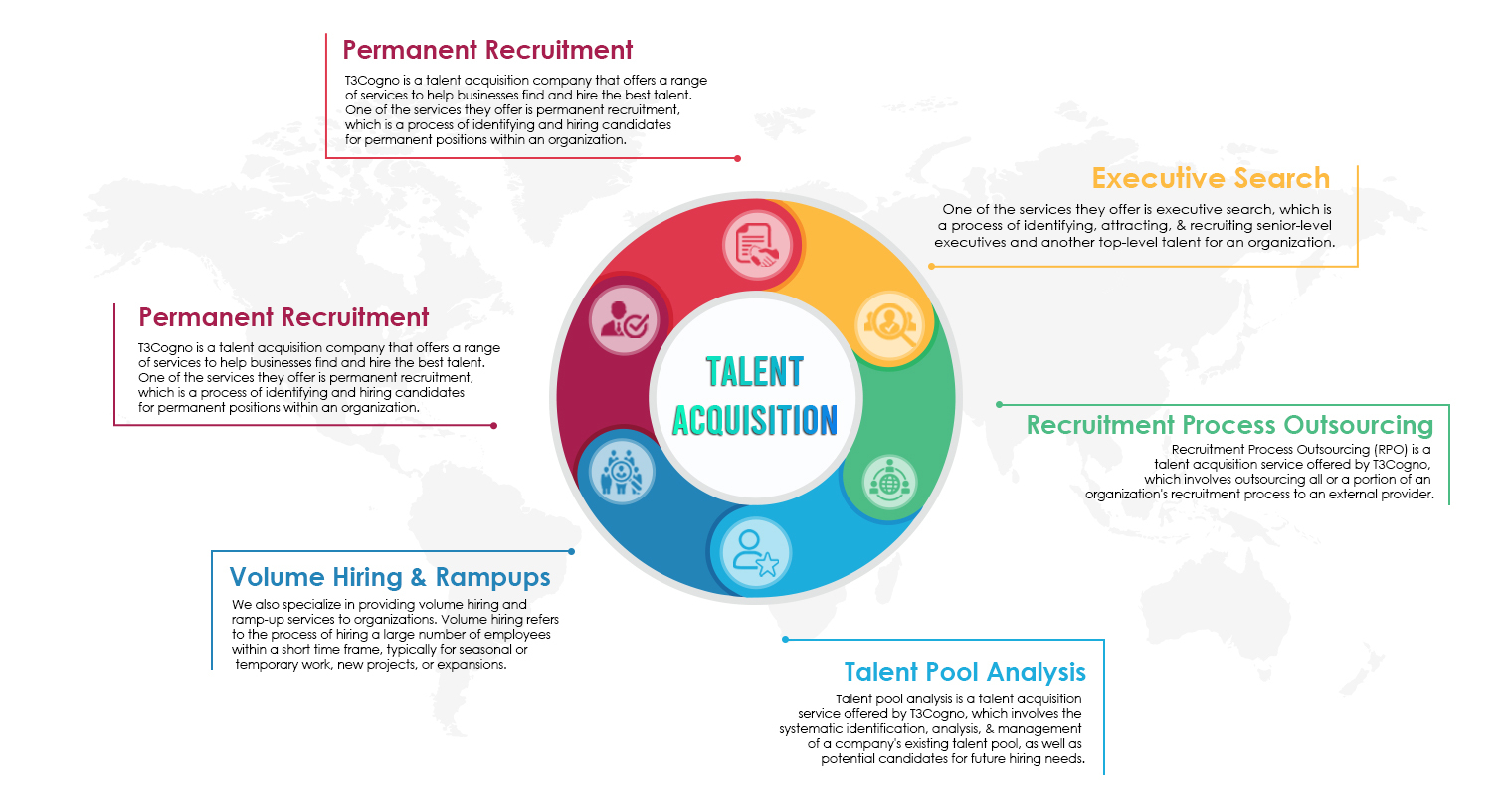 T3Cogno's talent acquisition services are designed to help businesses identify and hire top talent for their organization. We understand that finding the right candidates can be a time-consuming and challenging process, which is why we provide end-to-end talent acquisition solutions that cater to the specific needs of our clients. Our team of experienced recruiters uses a range of cutting-edge tools and techniques to source, screen, and select the best candidates for our clients, ensuring that they have the talent they need to succeed.